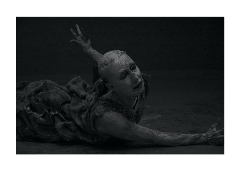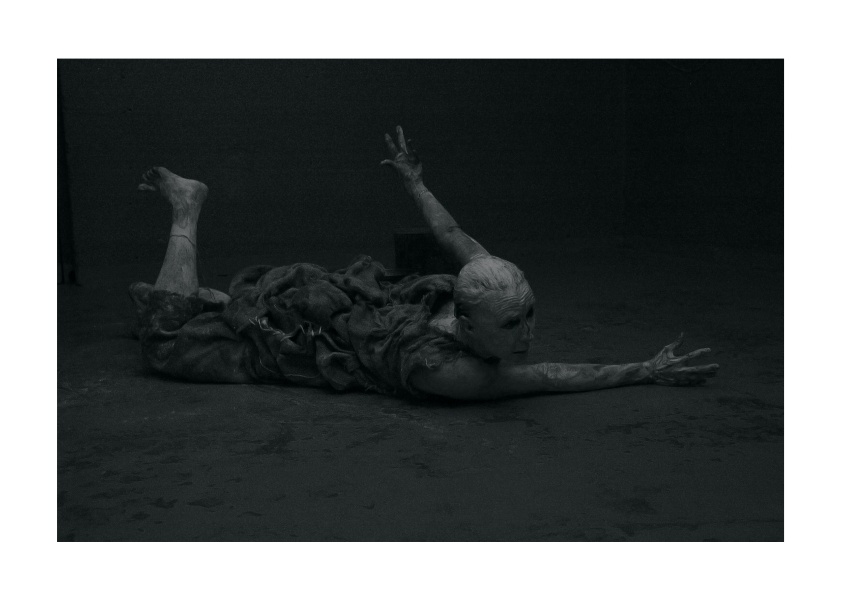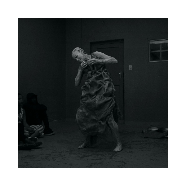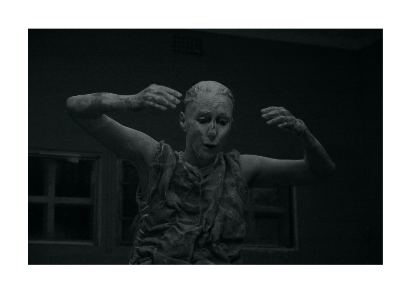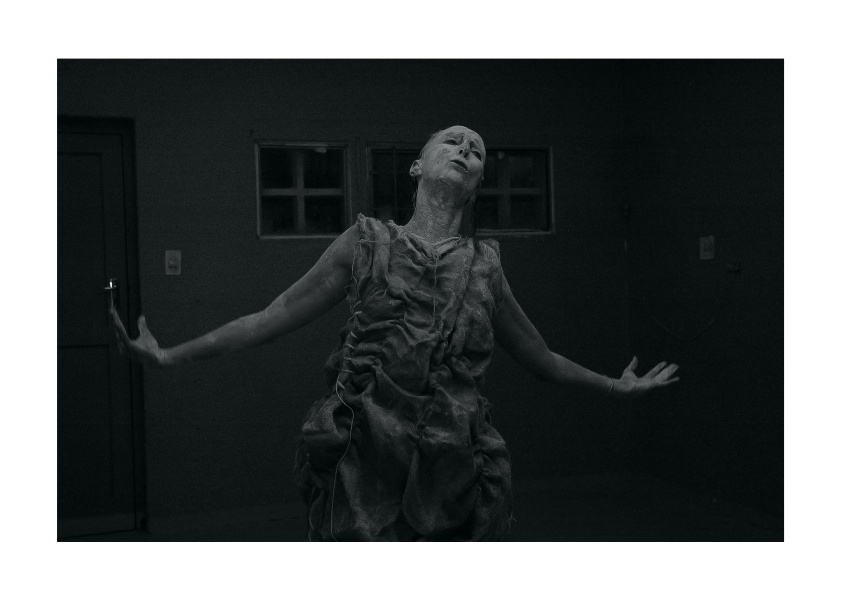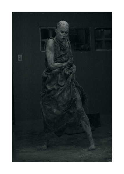 In my imagination for a costume I was inspired by the traditional herb traders of Macassar. They were standing on the side of the N2 hitch-hiking in their sack clothes and bare feet with bags and sacks all over their bodies, ashen skins against sack. It was a complete image, entirely of what they were willing to be in society. First I went to my friend Meraai to discuss the idea of a sack as costume. She asks immensely silent questions that I always feel should have been exasperated exclamations. On the street in Somerset West I met up with the herb traders where I had an opportunity to view their outfits from close. They bought coffee and rice sacks from a Woodstock shop and designed clothes from it. They appeared like short pants and jackets. Even waistcoats. With hems and seams, the lot. And knots for buttons. Days later I met with another friend Liesl at her mother Louna's place, where there was a sewing machine. Liesl began to pull threads from the sack fabric. We saw that pulling it diagonally would create 'peaks and valleys' which lend volume to the garment. We cut only one hole for my head. At home I painted the peaks white and the valleys were bleached with a brush. I pinned and tied the sides together with white string and my hands stopped at a precise moment when the last string was left hanging.