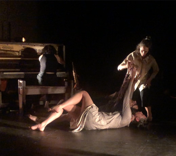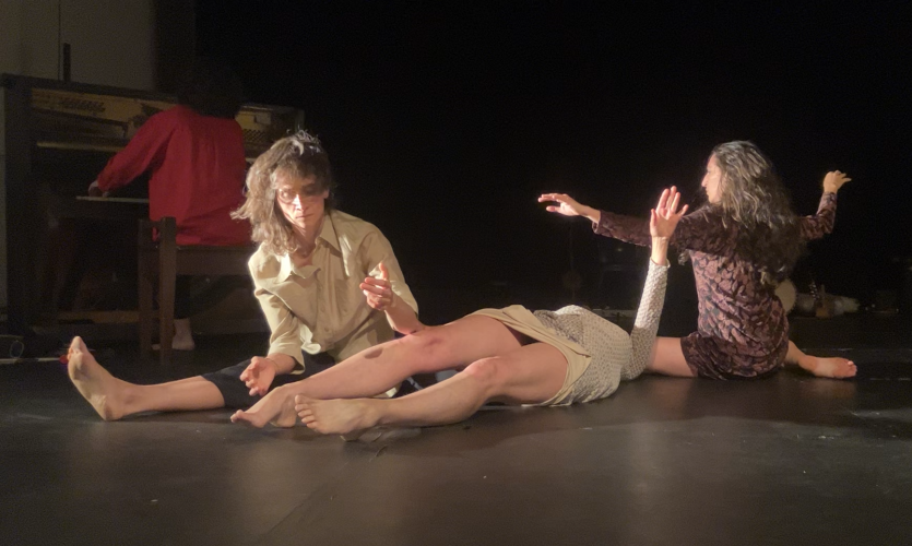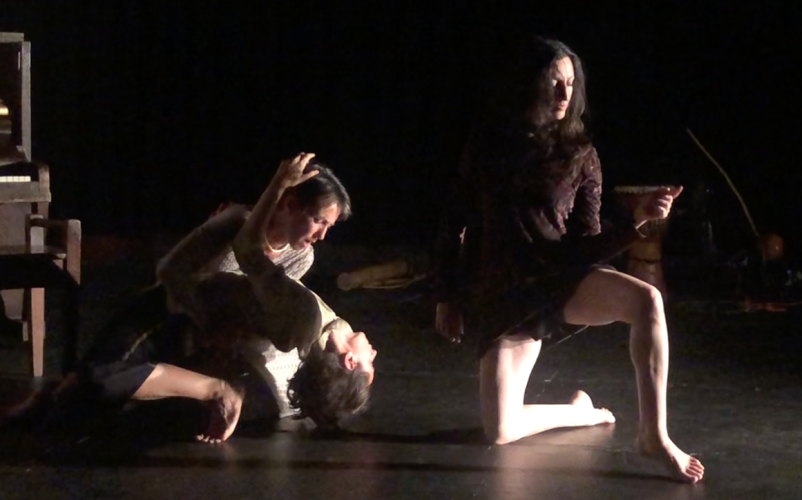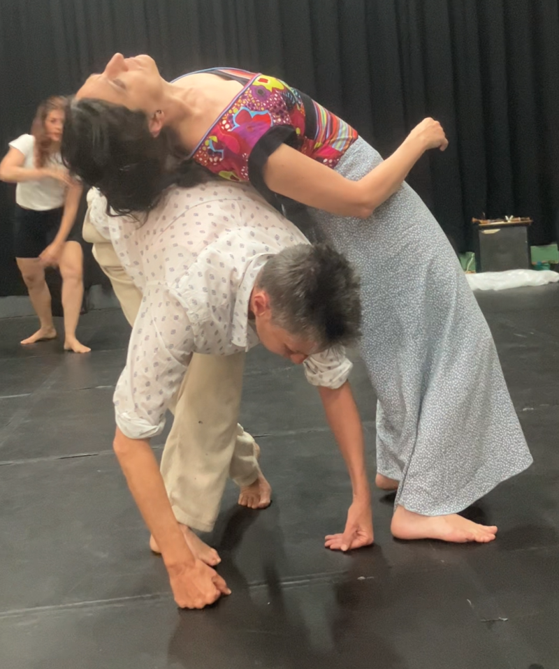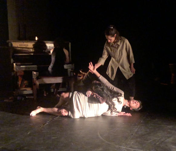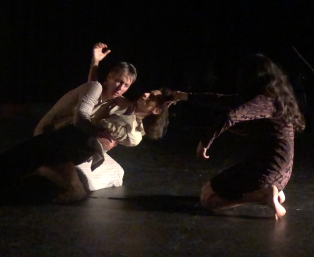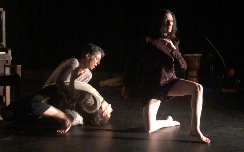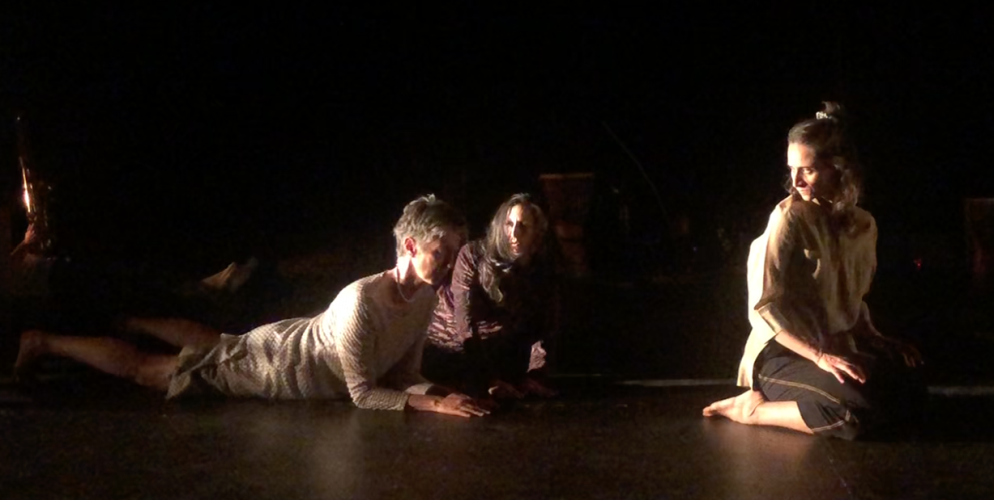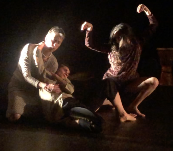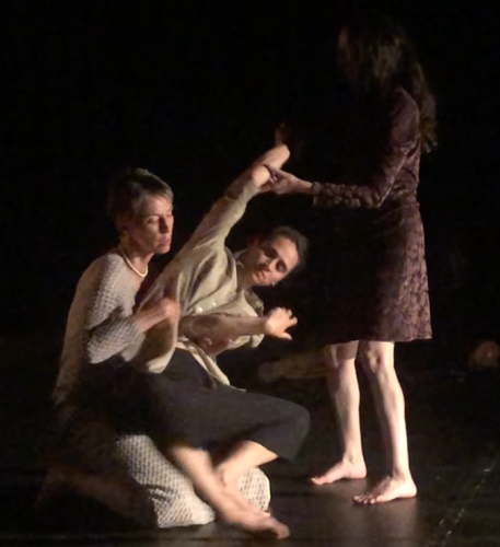 In this performance rehearsal all six of us were on stage all the time. However, the nature of our trio as dancers had a significant pattern shifting amongst the three of us in slow fashion with various "vortices" of relationality. It was like an alchemy with a particular formula. Two dancers and one separate, always alternating, with the one having a specific witnessing quality upon the two. The two ventured into specific dramatic qualities that evoked images and a viscerality of enfoldment, containment, gaze, hands, tumbling, draping, clasping, with strong engagement with hair, backs, hands and an unfolding drama we could not predict. Most of the movement motions had a rolling and irreducible movement poetics of intimacy. The choice of costumes (which did not take up much attention beforehand) played out as a grand feminine exposition of slow self-realisations within the intricate weaving of others', at once. It felt and appeared like a multidimensional narrative of women with a story they were revealing as solo and duo parts, ever intricate. An observer called this "Pietá". And evidence of this theme was shifting to all three of us over the period of the cameo. It vacillated between being and becoming through the other, the relational intelligible and the sensible, the divine and the mortal. Within the gravity of all movement nothing felt fractured or fragile. There seemed to have been a democracy of shifting and shiftable positions between solo and duo. The end marked places of isolation, departures, and silent marginal endings. At the end the centre of our cameo released its hold and freed three dancers to their own sense of destiny across the stage.