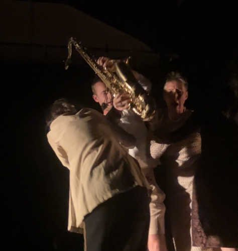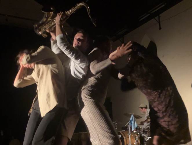 The actual public performance some days later, by the six of us took place with an equal openness as that of us, to our rehearsals. It always interests me what I title a performance the moment the cameo is complete. This performance cast itself in my mind as "Destruction & Survival". The initial dark stage introduced a cacophony of drums and saxophone. The piano responded with a repetitive sameness of notes. The sax warned of something imminent. Something ominous was to be revealed. Thalia displayed a moment of vigilant compassion. Then, if it was a film, the piano notes told us of the imminent scene as reflected in clouds. Back to the scene. Ben the drummer wanted to bring in a march, but it lasted five beats. From the start, and emerging, it felt that we were in a field of combat. Body parts flew past my field of vision. The musicians were on point with a most dramatic scene we were all creating. The human body felt dislodged from its anatomy, dislocated from a resonant field, and proximities were unrelated to something coherent. Imagine a flood, explosion, or tumbling building, all with a slow motion of a violent ecology in which we did not have much control. At times individuals felt as if they were collecting themselves to be tumbled under yet again. Yet, then there were moments of unquestionable gaze towards others, with a silence of realisation, an apprehension that we could meet in a momentary cohesion. Even compassion. And human embrace.