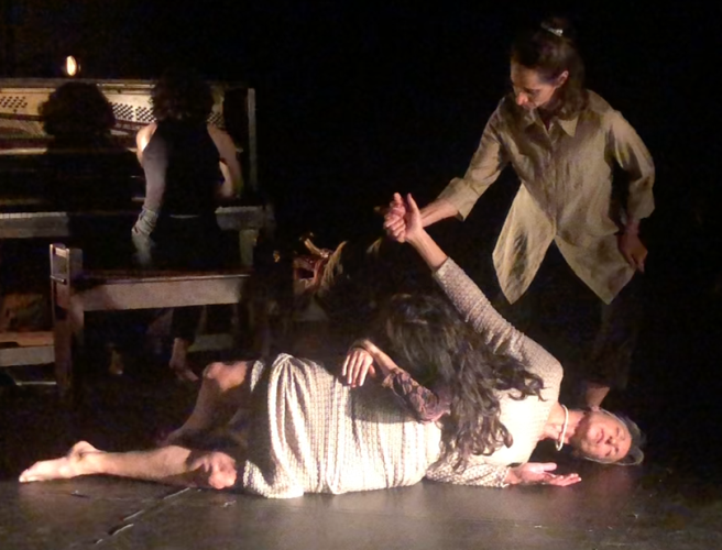 But then a force dislodged the humane factor once again. Survival took the front of action amidst destruction. A body could turn into a ledge onto which one steps to escape. The combat was for the self and other bodies became objects in this endeavour. By the time we were all on our feet, the musicians were drawn into the front of stage of this scene. A violence streamed in. The field was damaging to all and everything present. Surviving at all costs happened at the time when the saxophonist burst through the dancing bodies. His instrument became a weapon with a panting, flipping rhythm without any sound. No one was prepared to let up and release the tension through an exit. All musicians and dancers sustained the high tension albeit in degrees of slow motion. I notice the exasperation on my face. The tragedy rolled out. The soft faces of people out of control flung about. Images I often pay attention to in acts of war, became part of the scene. Suddenly it was all over. Dancers and musicians were separated on the stage, some of us in unusual postures, like stills of the aftermath. What was that? Where are we? Who are we? What have we become? Coila mustered muffled deep notes, asking these questions. The percussionist Ben Brown walked with one part of his drum kit and stand onto the scene of the aftermath, lowering onto his knees. I contorted. Thalia wriggled rapid contortions in an isolated space. I supported Manuela to lower by holding her head. Next, she was on my back and Thalia contorted backward towards us. I landed on my back with the two dancers on my sides. It was the aftermath, people disheveled. Manuela sustained her arms softly in a cross to her body. Thalia opened her hands in a revelation of what was in her palms, then rested her hands on my legs and later on her own, a gesture of what was a re-turn, to be recognized as human. Colia-Leah offered the last piano notes with Ben's soft drumroll into a fading light by most tuned up and sensitive lighting technician, Frans Mandilakhe.