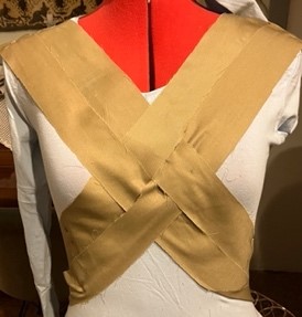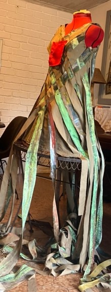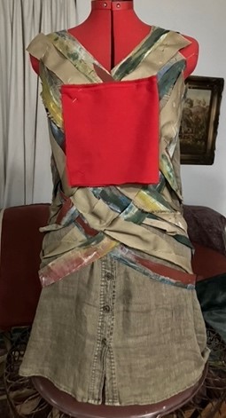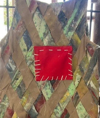 I painted one half of the fabric and began to cut it all into strips. Onto a neutral piece serving as lining, I began to construct the weaving from the top to the bottom of the costume. I found the weaving process to be immensely satisfying in a mathematical, thought, visual, kinesthetic and visionary way. There was something deeply erotic in the diagonal precision across the body of the costume. It aligned itself with ease of eye and hand movement. The strips were very long and I figured that there might come a time when they would be cut. At each intersection the weaving mechanism had to be sewed, so each crossing times four. As soon as the bodice reached some substance, I cut out the two red squares and pinned them on. I could see the necessity of this feature, yet without a performance in the costume its significance would not emerge for me as yet.