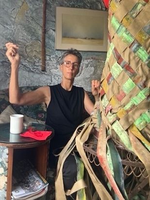 From the start of this performance operation, I contacted another neighbour, Carey Yarrow. Once Carey knew what my vision was, she held me to it in the construction of my costume. It was a particularly privileged position to be in to discuss my next moves in the painting, cutting and sewing of the strips that would finally weave my body into lanes of brown and other colour. Her instinctive grip on the meaning of the red squares, and again holding me to it, was a sign of a true mediator for my vision to materialize itself, ultimately through performance.